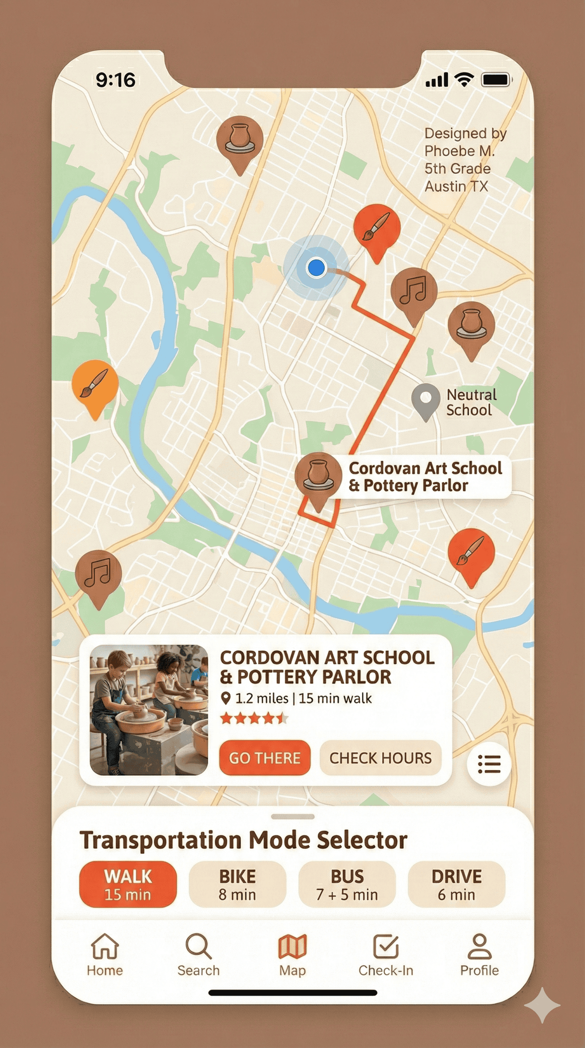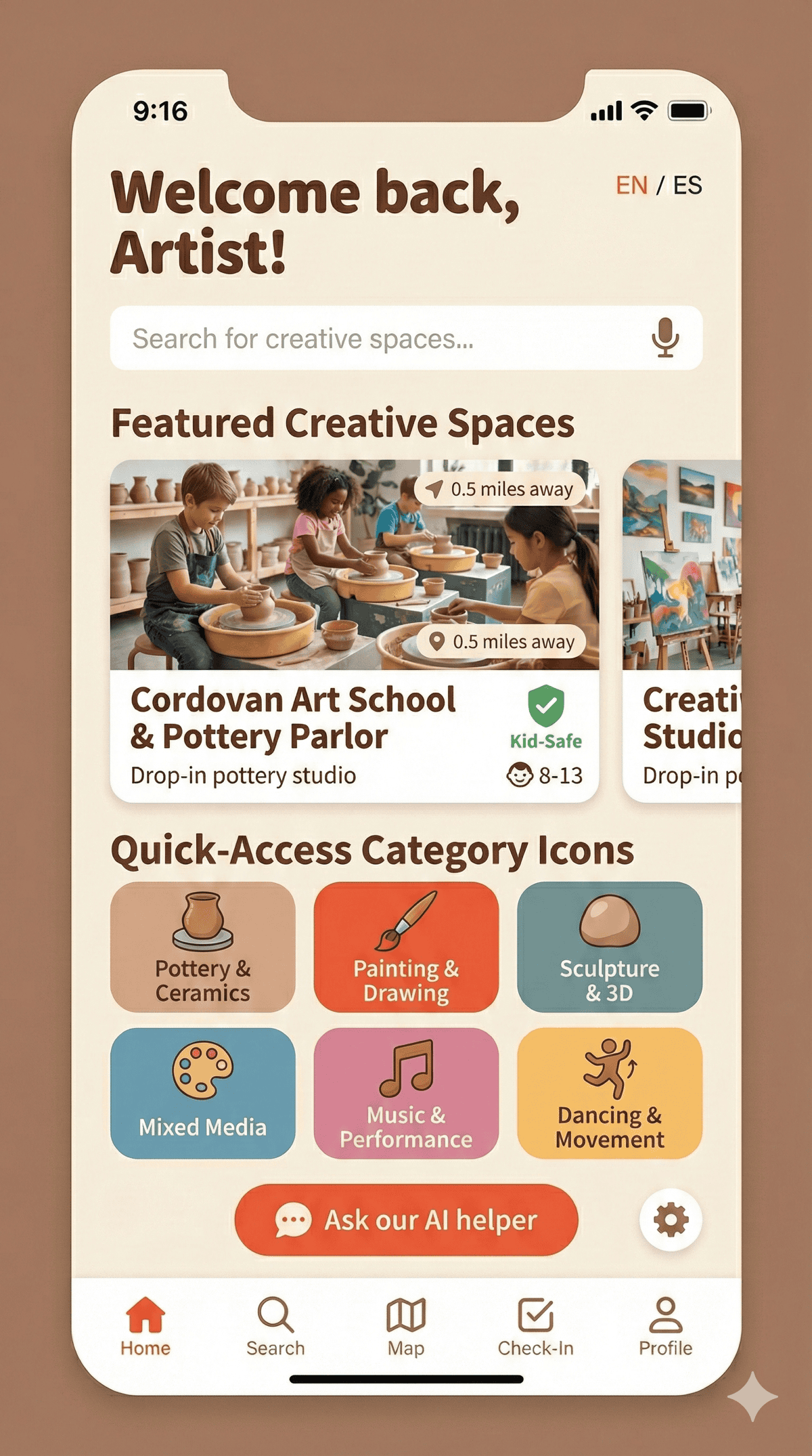 A dyslexia-friendly app that helps kids discover pottery studios and creative third spaces in Austin, with bilingual support.