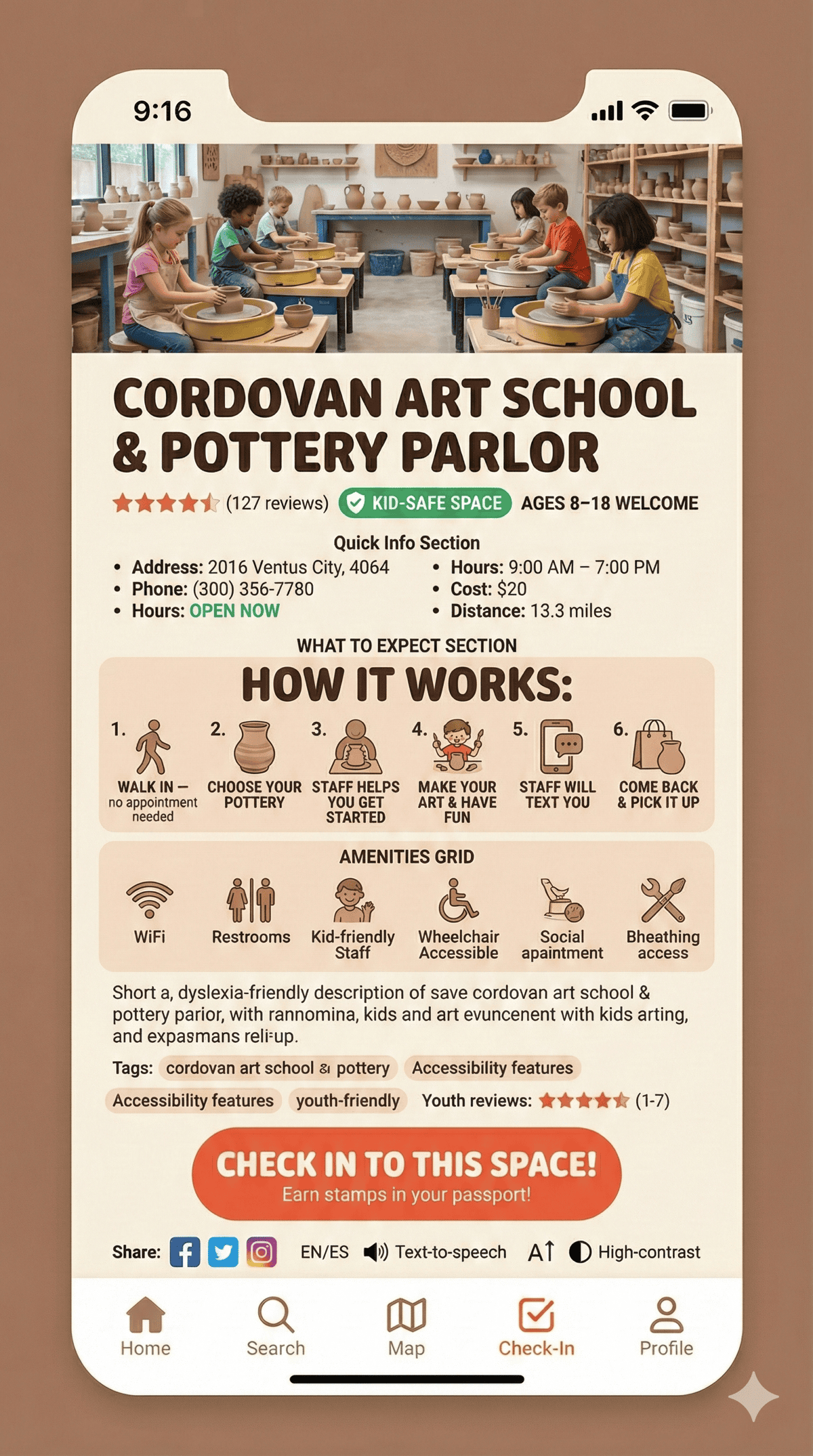 The heart of ArtSpace is the βWhat to Expectβ feature. Phoebe knows that visiting a new place can feel scary, so each venue page walks you through exactly what happens step by step: walk in, choose your pottery, staff helps you get started, make your art, and they text you when itβs ready to pick up. No surprises, no anxiety β just clear, friendly guidance so every kid feels prepared and welcome.