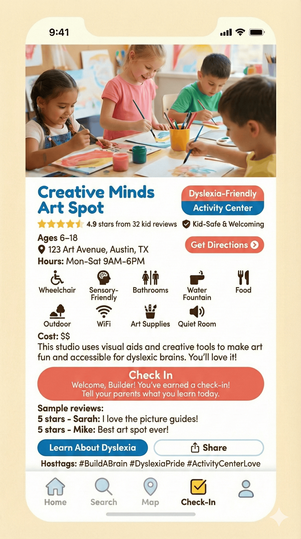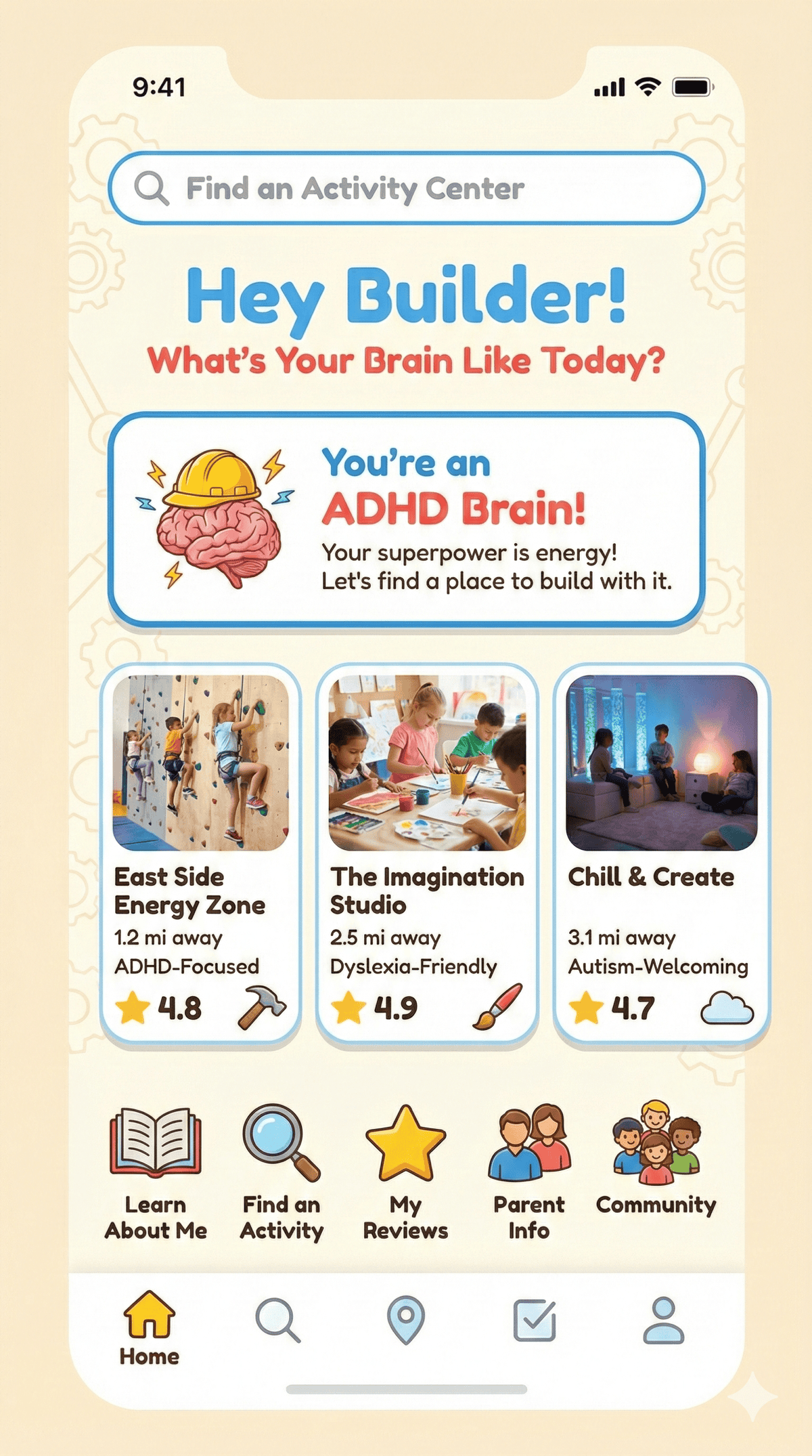 Build a Brain is an app that flips the script on how kids with disabilities find places to hang out. Instead of making kids fit into generic spaces, it connects them to activity centers specifically designed for how their brains work. Whether you have ADHD, dyslexia, autism, Down syndrome, or dysgraphia, this app finds your people and your places.