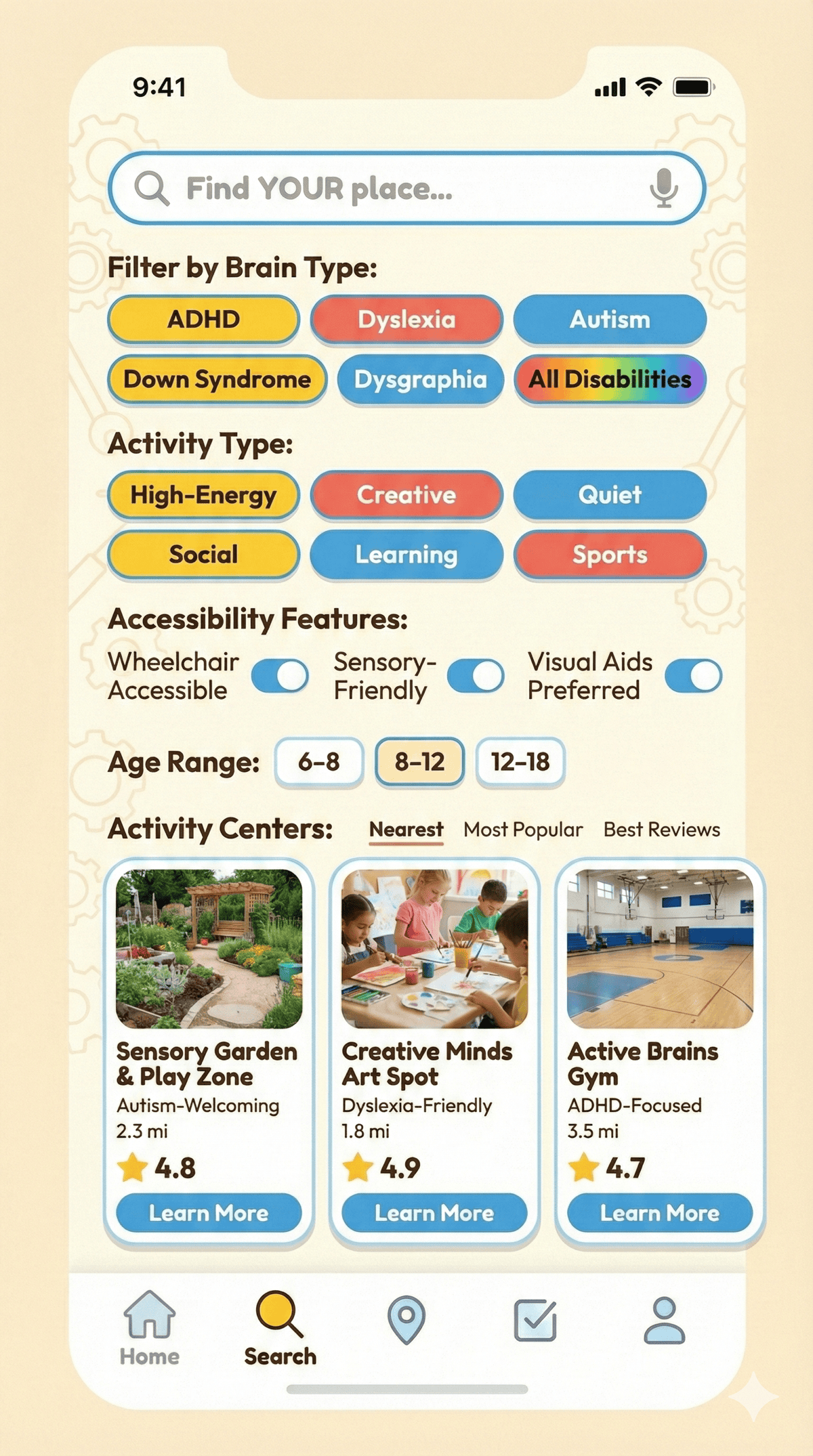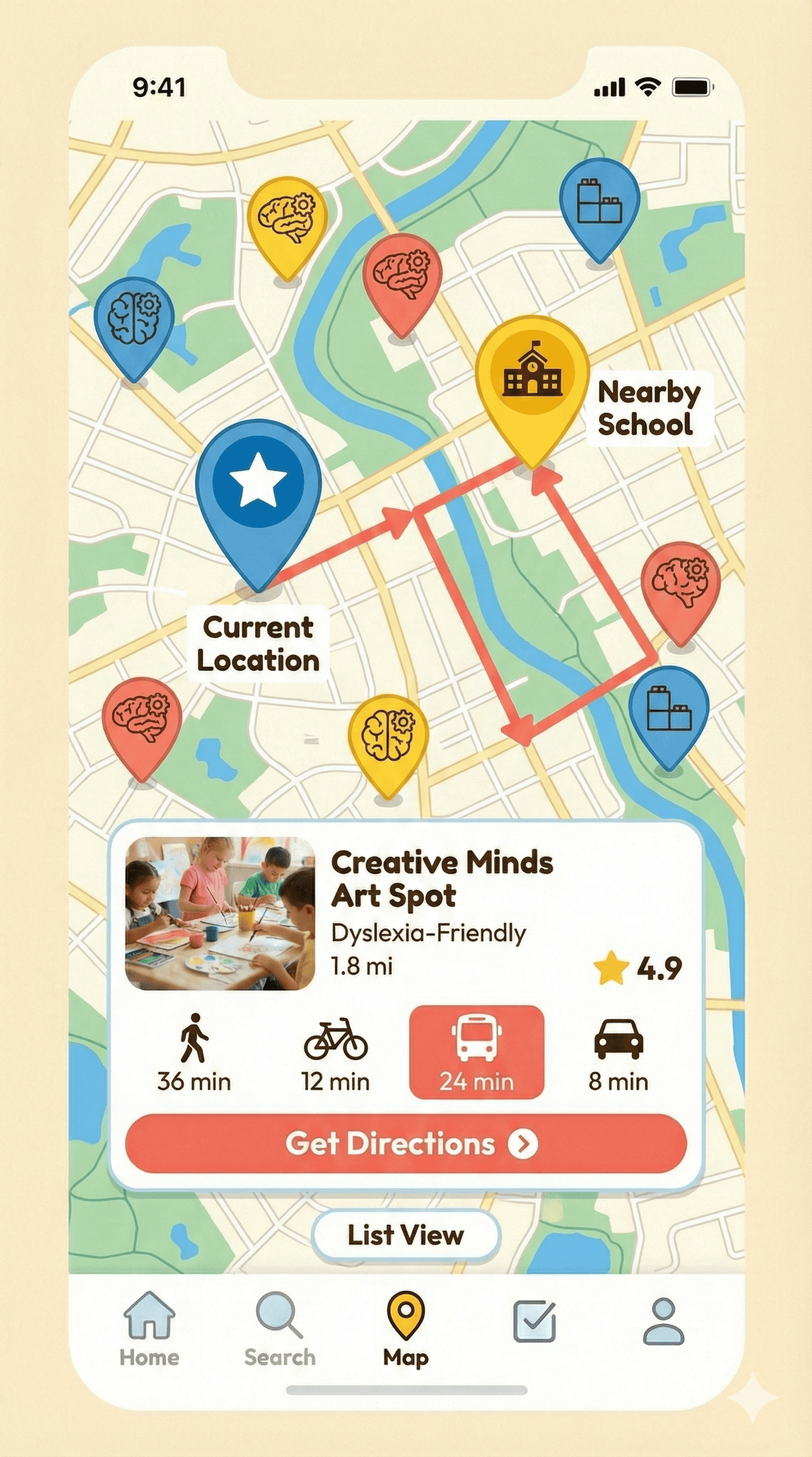 The app starts by asking what kind of brain you have, then curates everything around that. ADHD rooms have high-energy activities with space to run around and burn off steam. Dyslexia rooms tap into imagination with drawing stations and art. Each disability gets activities that treat your brain as a superpower, not a problem. You can search by brain type, activity style, and accessibility needs, or explore an interactive map to see what is close by โ including bus routes for kids who do not have a ride.