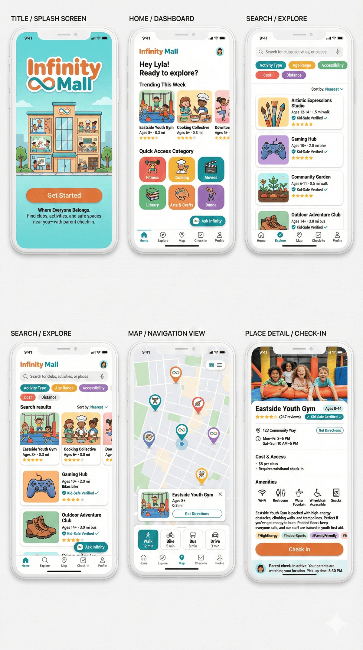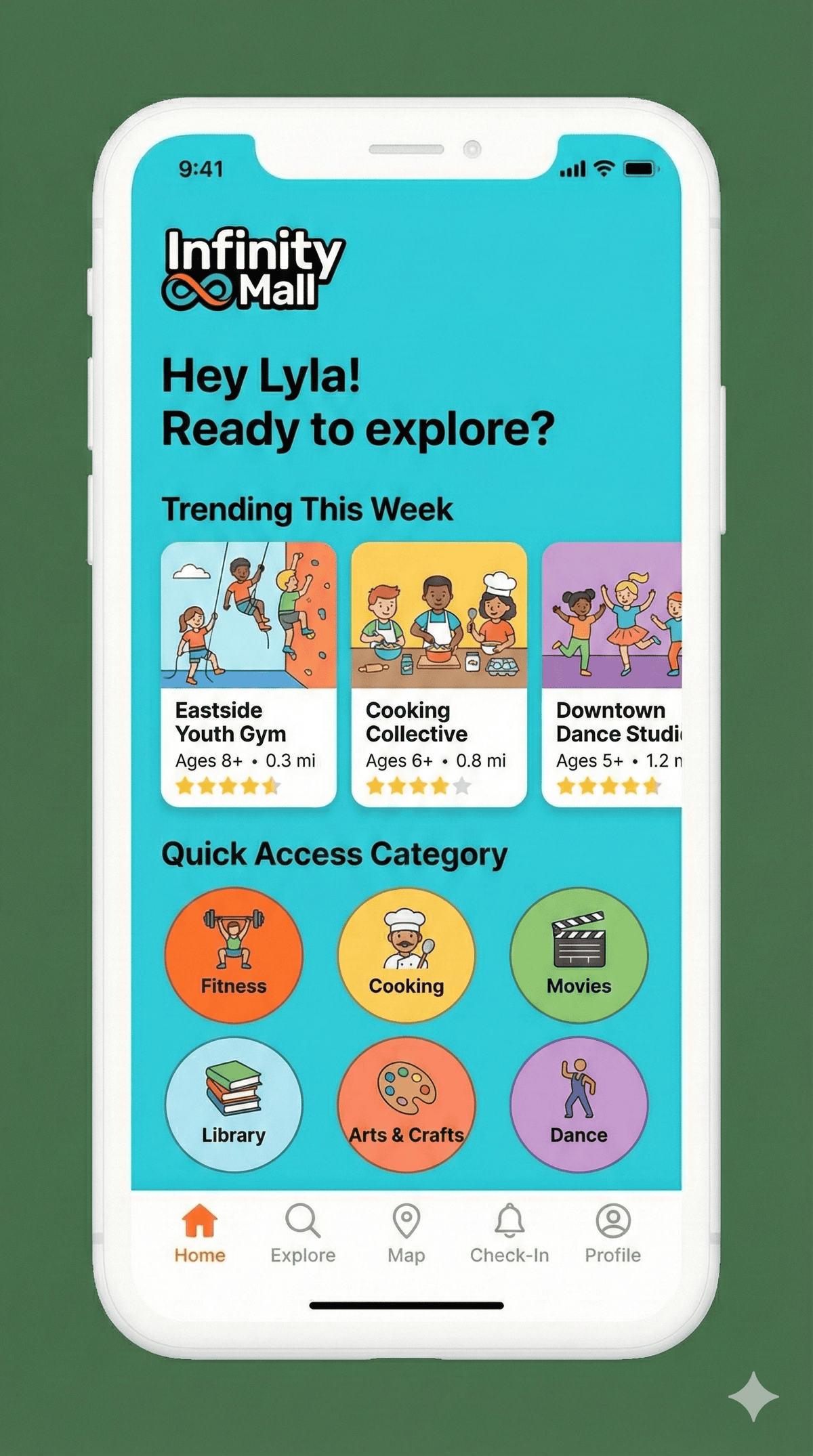 Imagine a place where every kid belongs β a massive, welcoming hub packed with clubs, activities, and safe spaces for every age and interest. That is Infinity Mall, dreamed up by Layla and Stella, two 6th graders from Austin who wanted to solve a real problem: helping families (especially single parents) find trustworthy places where kids can have fun while parents know exactly where they are.