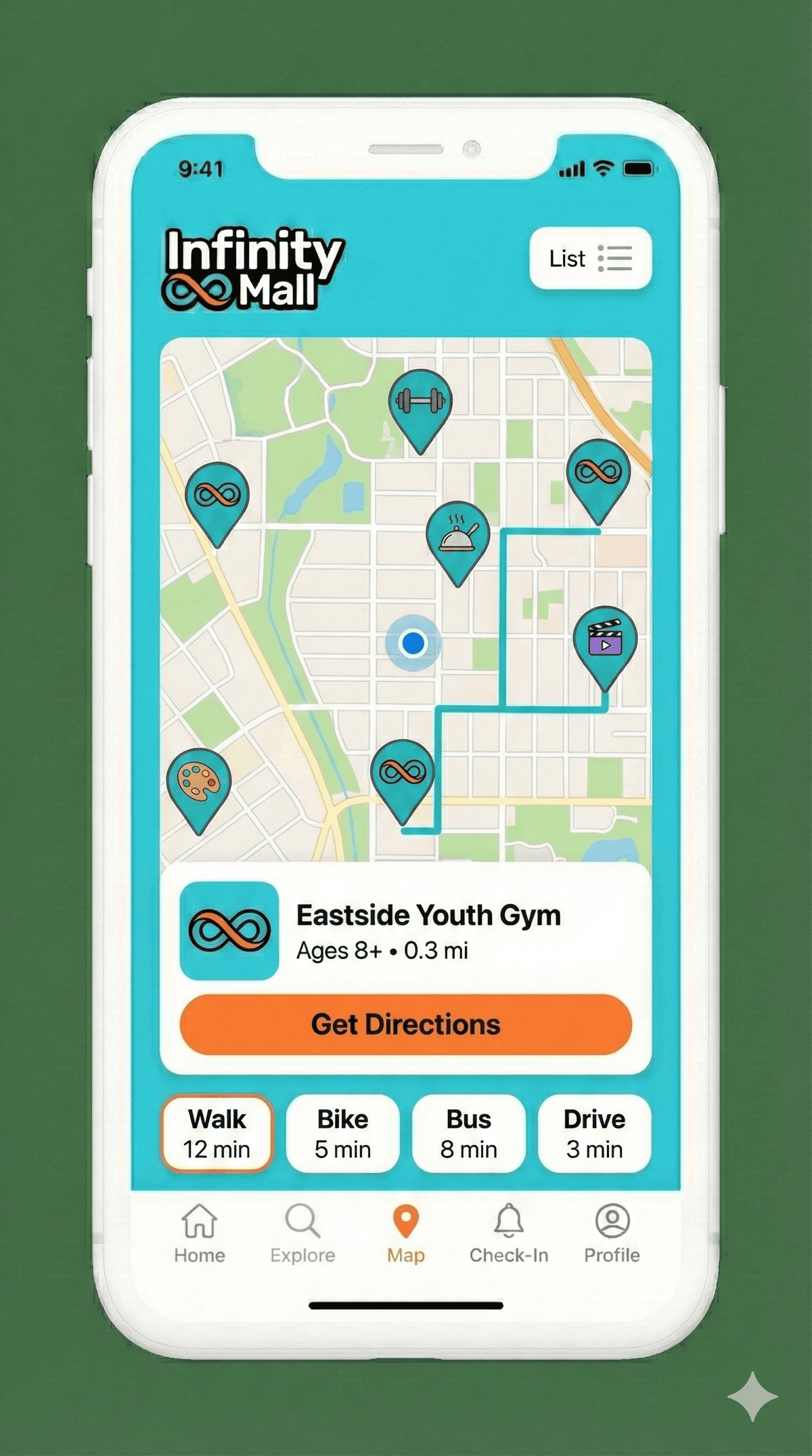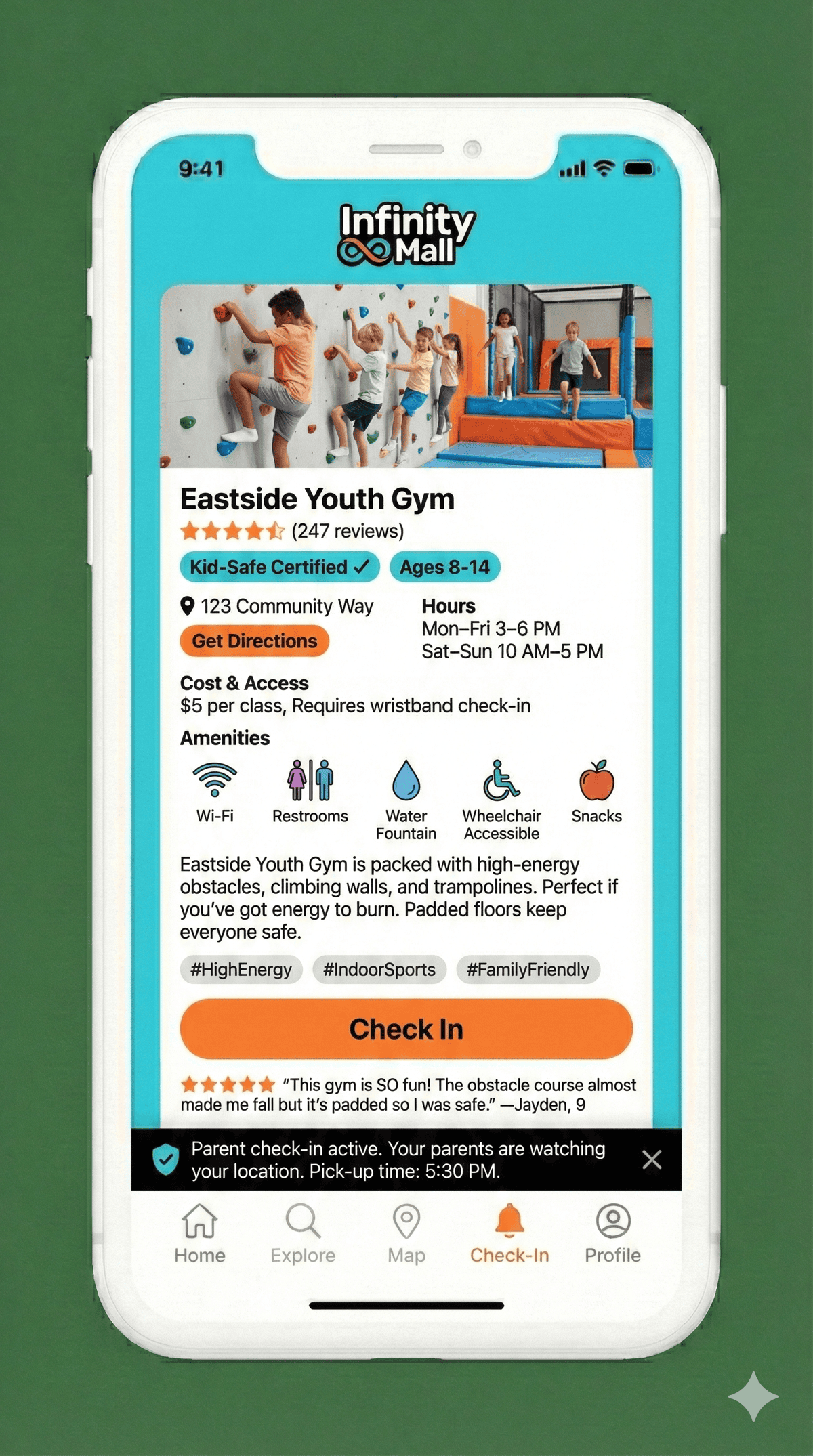 Infinity Mall centers on a smart wristband system that makes safety feel effortless. When kids arrive, they scan their wristband to check into a club β whether it is the workout gym, cooking club, dance floor, movie theater, or an obstacle-course playroom for high-energy moments. The instant a kid checks in, their parent or guardian gets a notification with the club name, location, and estimated pick-up time. Activities are age-gated so younger kids see only what is right for them, and security guards verify IDs at the mall entrance. Everything is designed so families can trust the space completely.