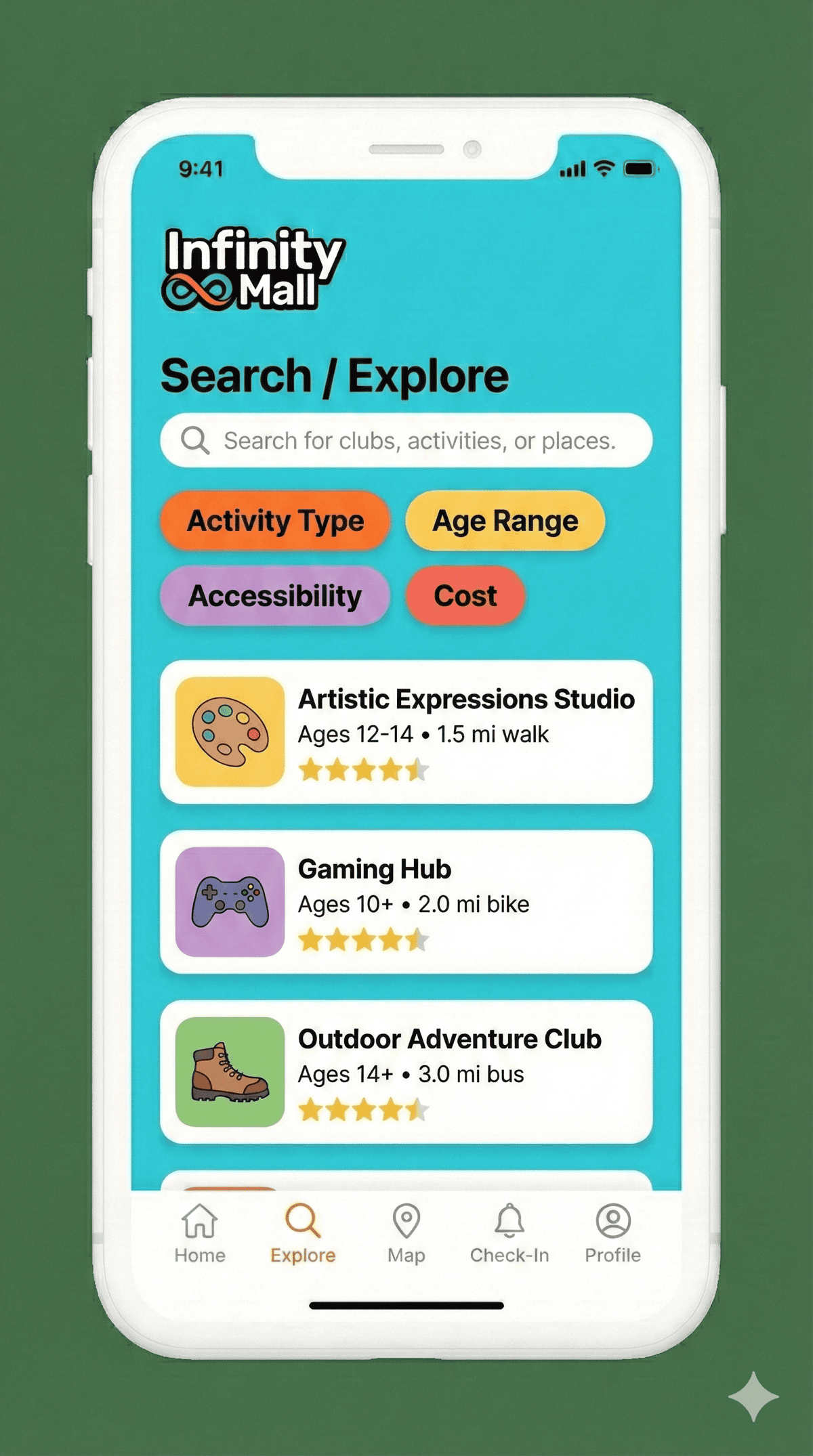 Layla and Stella built Infinity Mall with heart. They thought about kids going through tough times β divorce, loss, loneliness β and wanted to create a place where those kids could escape, explore new interests, and feel like they belong. With visual-first icons for every activity, wheelchair accessibility baked in, and a search experience that filters by cost, distance, and sensory needs, Infinity Mall is not just fun β it is designed for everyone. As Layla put it during their presentation: they want every kid to know βthereβs somewhere safe to go, somewhere fun, somewhere you belong.β