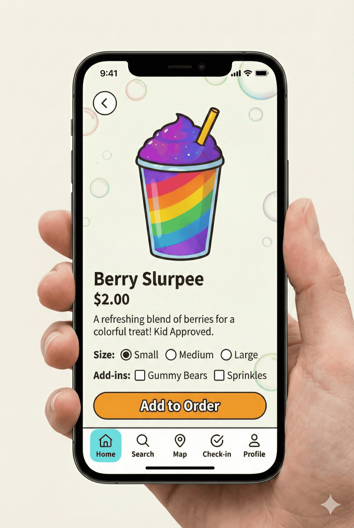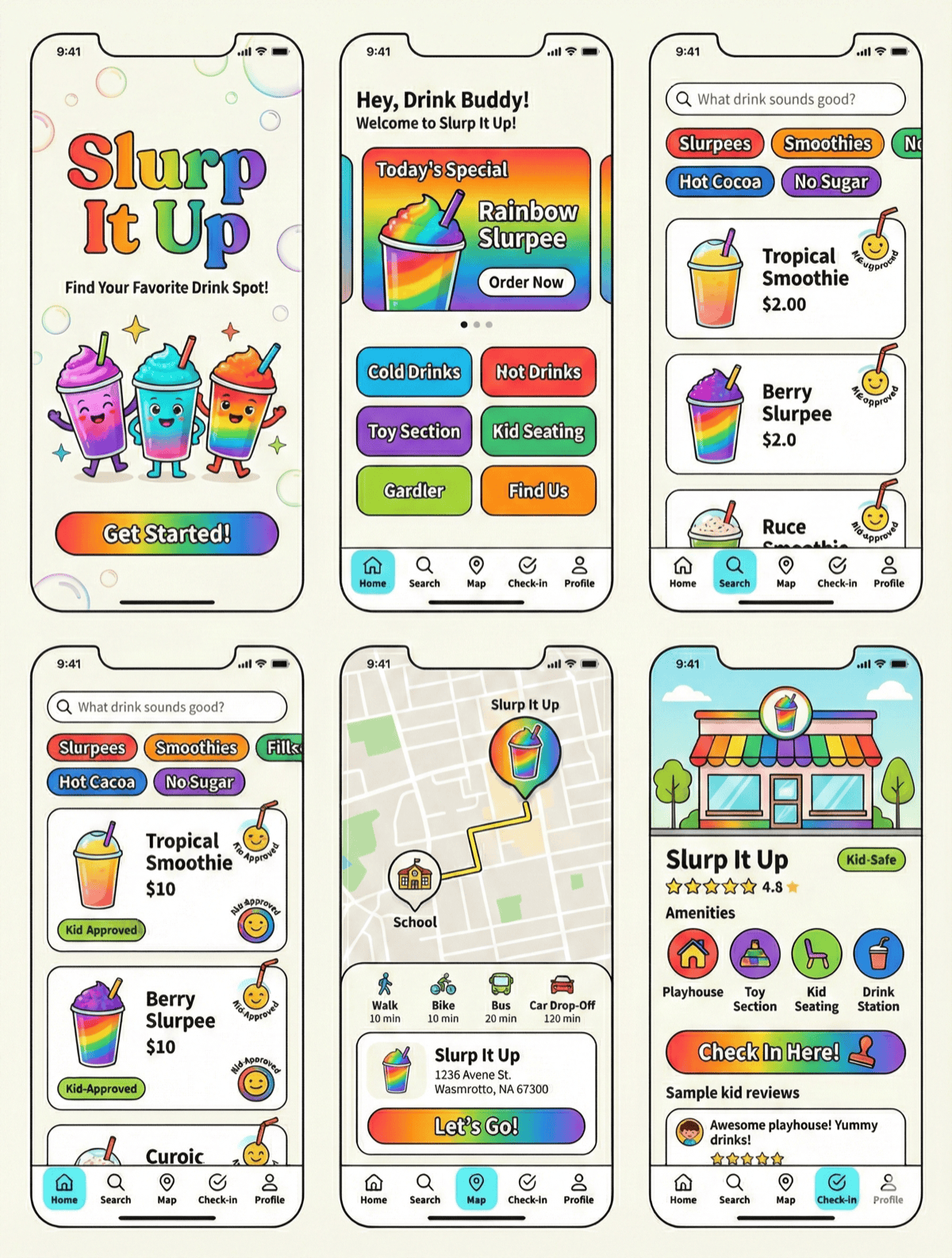 Slurp It Up is not just another drink shop β it is a true third space where kids can be themselves. Luke thought carefully about the physical details: shorter tables for kids, taller tables for adults, a fountain-style drink station with slurpees, smoothies, hot cocoa, teas, and sodas, plus a whole play area in the back. The app brings all of that to life with a search-and-filter system that lets kids browse drinks by type, a kid-approved badge on every item, and an ordering flow with fun add-ins like gummy bears and sprinkles.