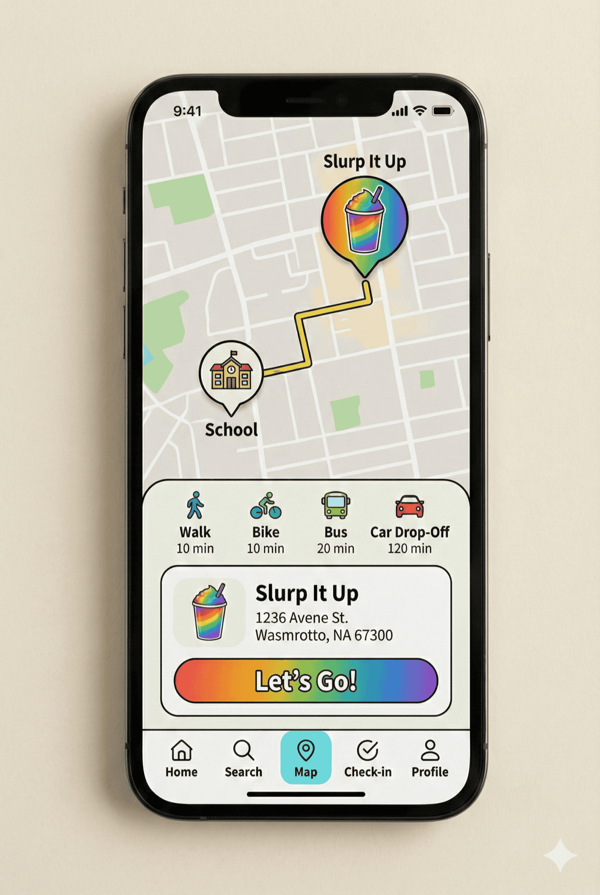 The map screen shows exactly how to reach Slurp It Up from school or home, with options for walking, biking, taking the bus, or getting a parent drop-off. Once kids arrive, the place detail screen gives them everything they need: hours, amenities, reviews from other kids, and a big colorful check-in button. Lukeβs vision is simple and powerful β a space where hydration meets play, designed by a kid who knows exactly what kids want.