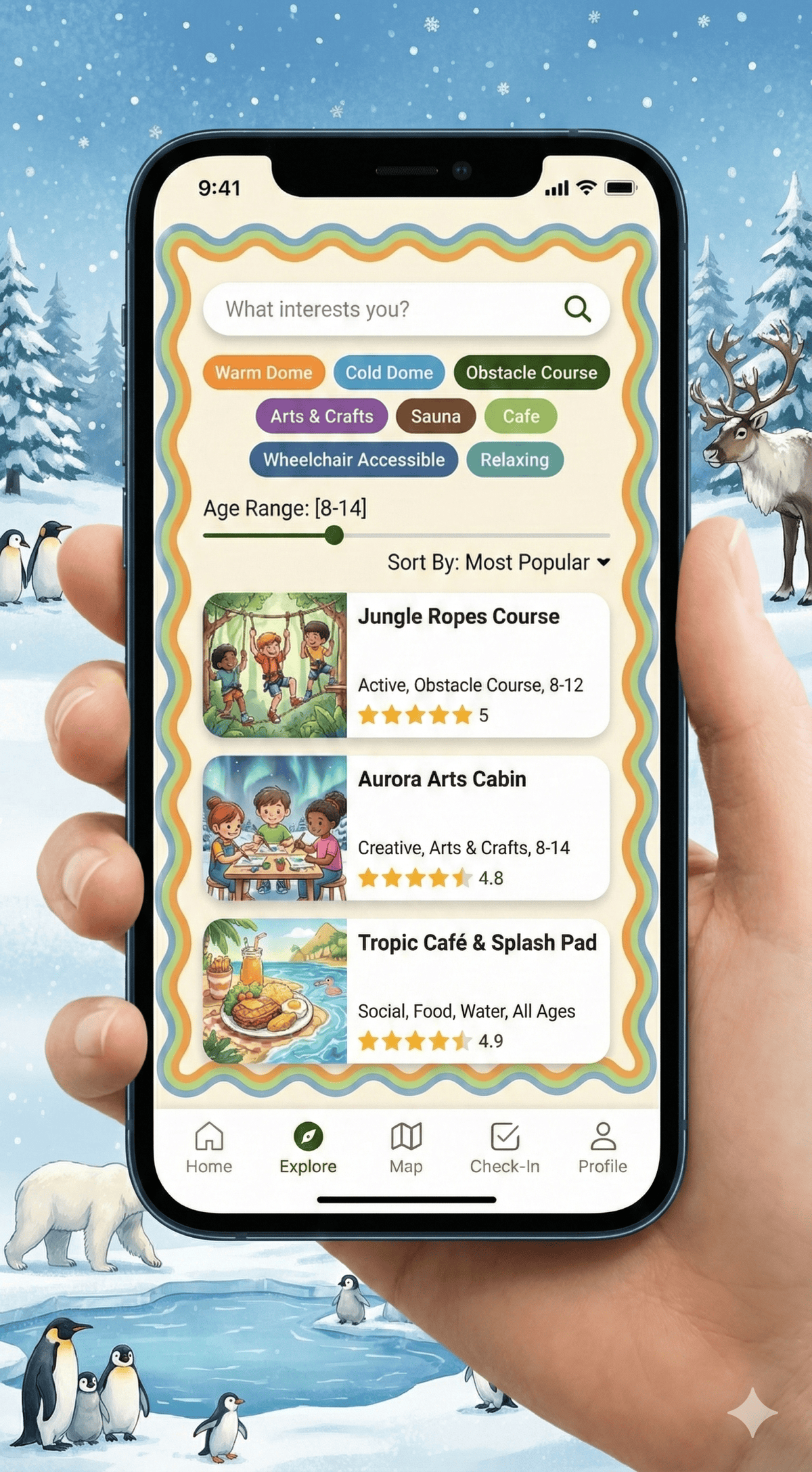 The app does more than just show off the center. It helps you plan your whole visit, from browsing activities by dome and filtering by age, to booking tickets and loading funds onto a smart wristband so you never need to carry cash. Parents can sign waivers digitally, control spending through the wristband account, and feel confident their kids are in a safe, curated space. There are even options for school field trips, private events, and memberships.
