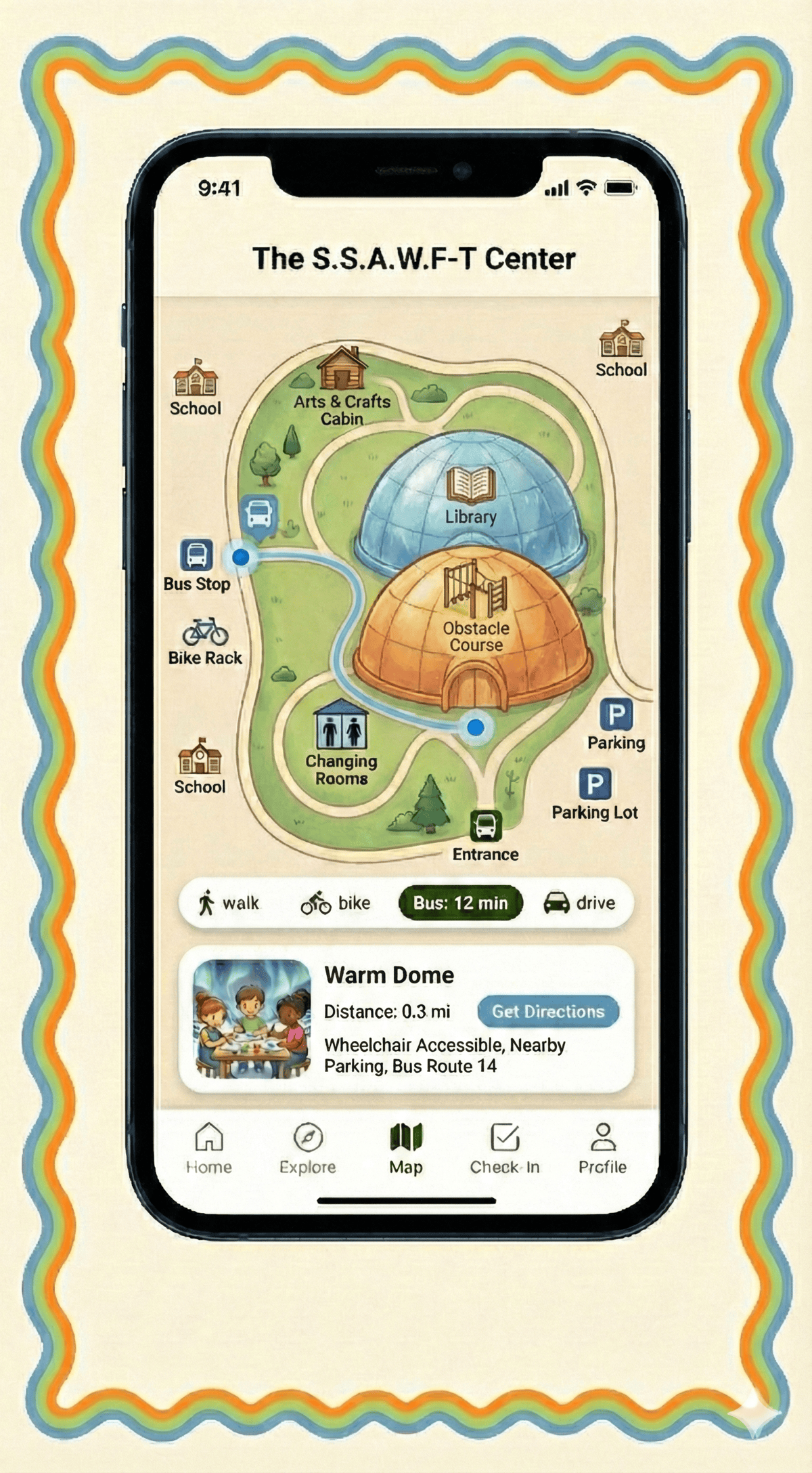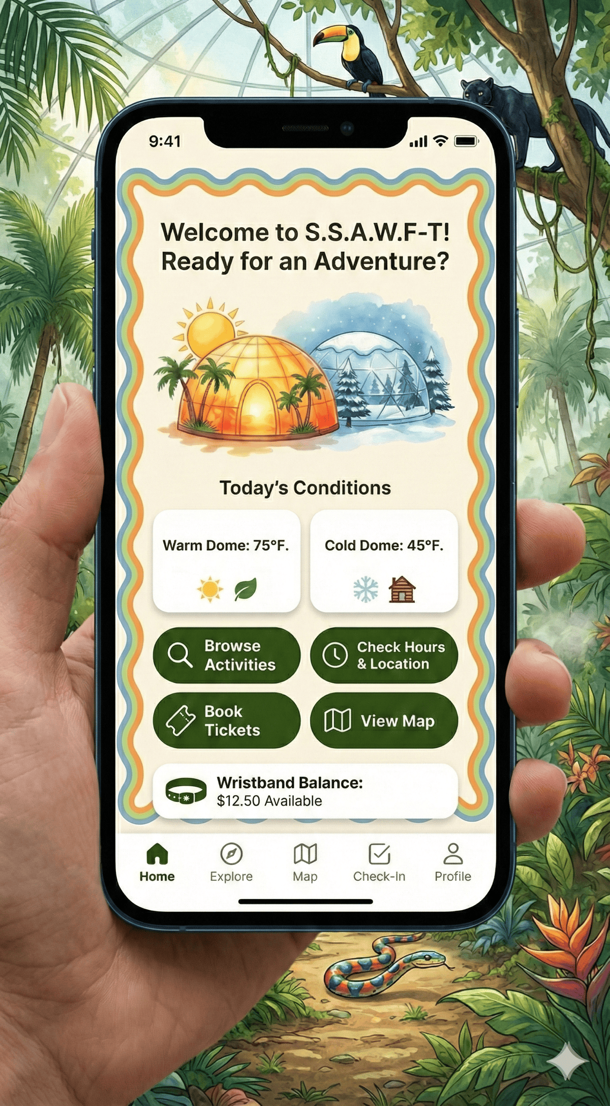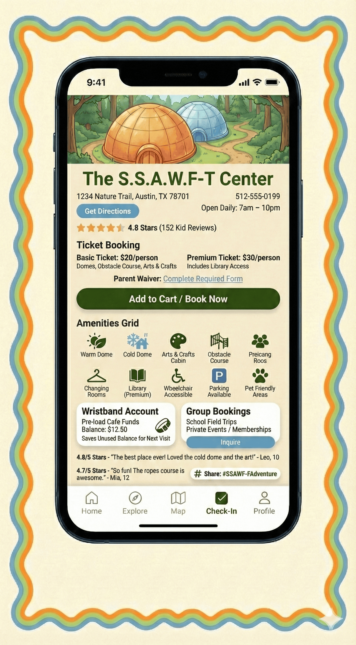 What if you could experience all four seasons in one place, any time of year? That is the question Clark, Rozi, and Harper set out to answer with the S.S.A.W.F-T Center β short for Summer, Spring, Autumn, Winter, Fall, and Tree. Their app guides kids and families to a one-of-a-kind nature destination featuring two climate-controlled domes: a warm dome with a cafe, obstacle course, and changing rooms, and a cold dome with a sauna, arts and crafts cabin, and cozy sweater-weather vibes. No long drives, no unpredictable weather β just nature, adventure, and fun.