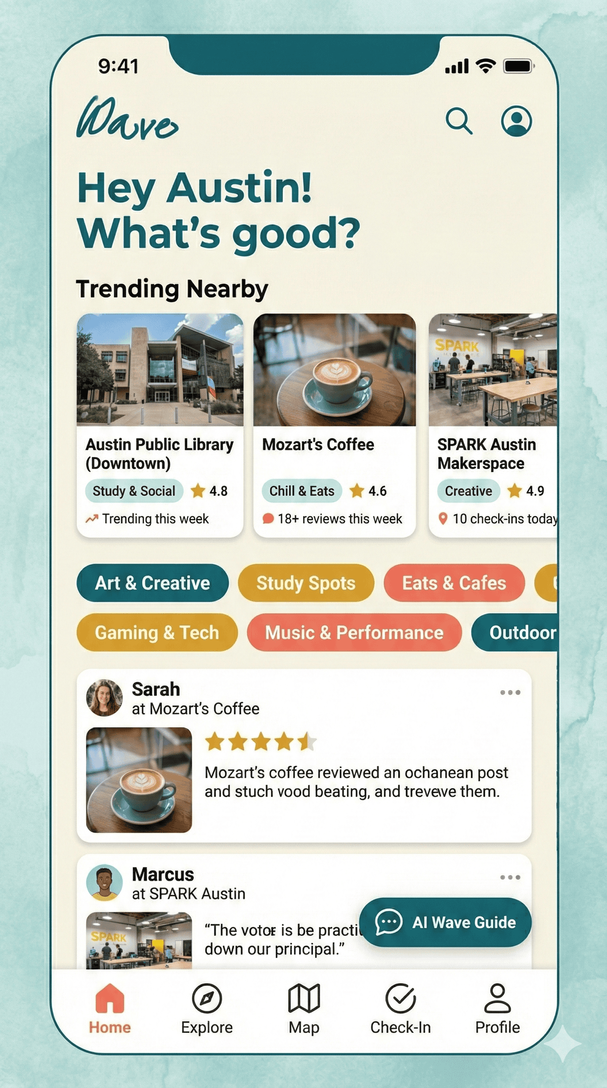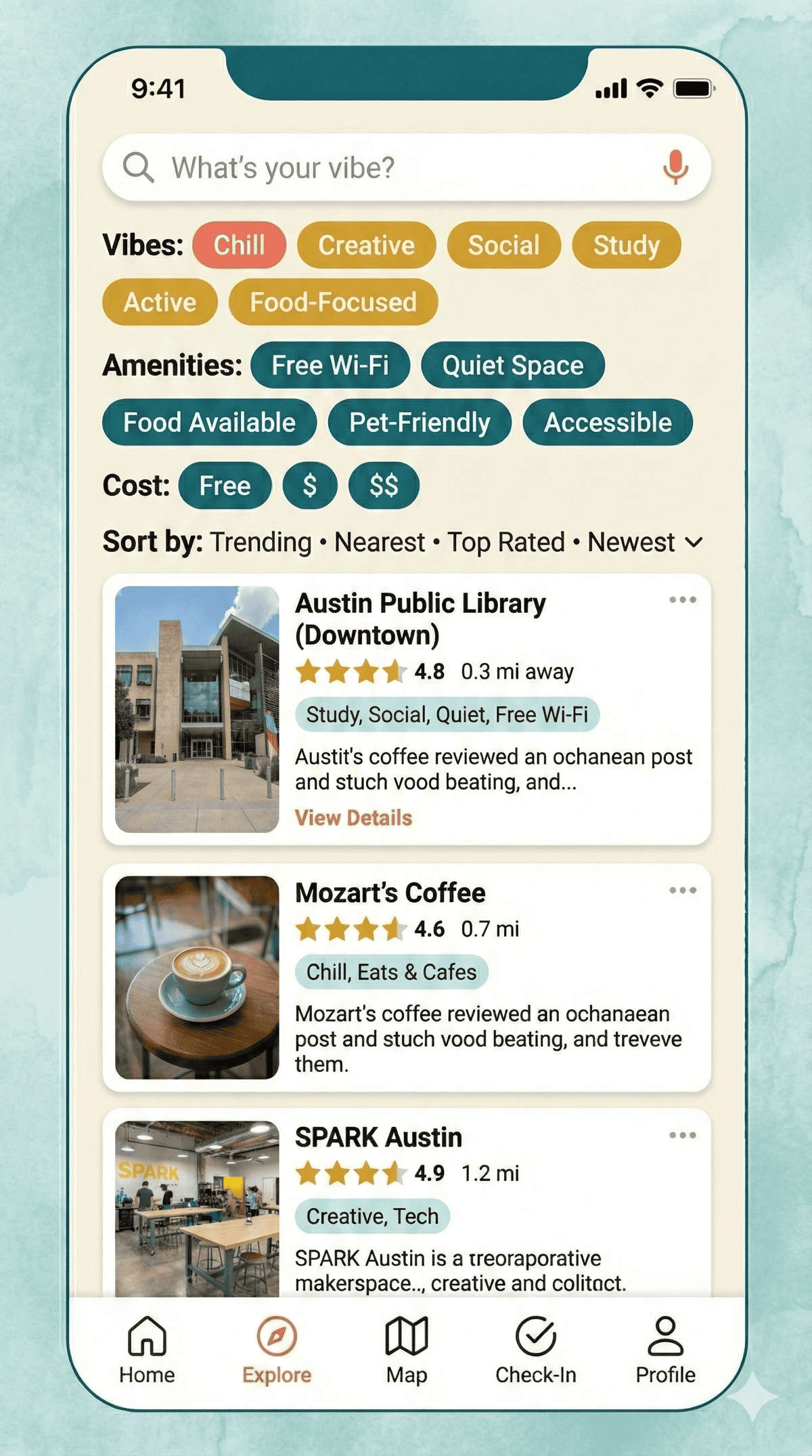 Most third space apps are utility tools: search, find, go. Wave flips that by making social sharing and peer recommendations the core experience. When you open the app, you see what your friends checked into this week, which spots are trending among Austin teens, and honest reviews from people your age. The map is the organizing structure, but community is the engine. Vibe-based filters like βChill,β βCreative,β and βStudyβ let you search by mood instead of keyword, and amenity tags β free Wi-Fi, pet-friendly, LGBTQ+ friendly, accessible β help you find spaces that actually fit your needs.